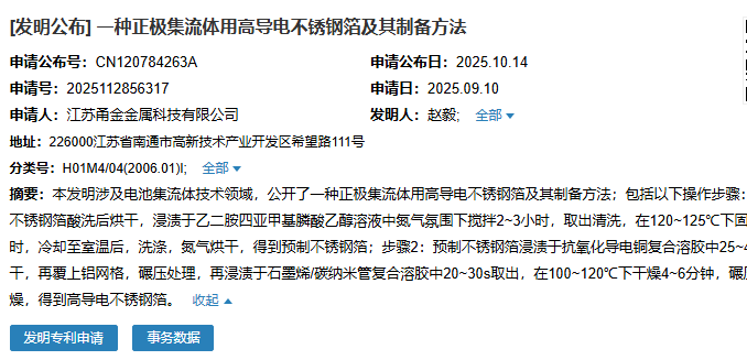 2025年10月14日,江苏甬金金属科技有限公司成功申请一项名为“一种正极集流体用高导电不锈钢箔及其制备方法”专利,申请公布号为CN120784263A,申请日期为2025年9月10日。